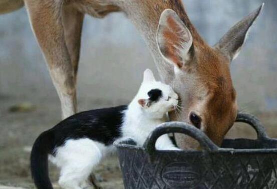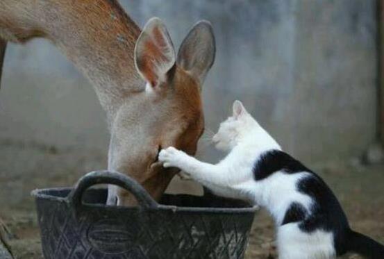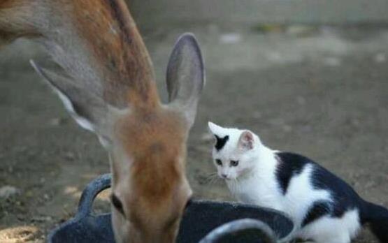 一只黑白相间的小奶猫,正蹲在篮子旁美滋滋地吃午餐。它的毛色亮得像刚洗过,篮子里装满了香喷喷的猫粮。谁知,半路杀出一头小鹿,盯着猫咪的饭碗,毫不客气地伸嘴就抢!